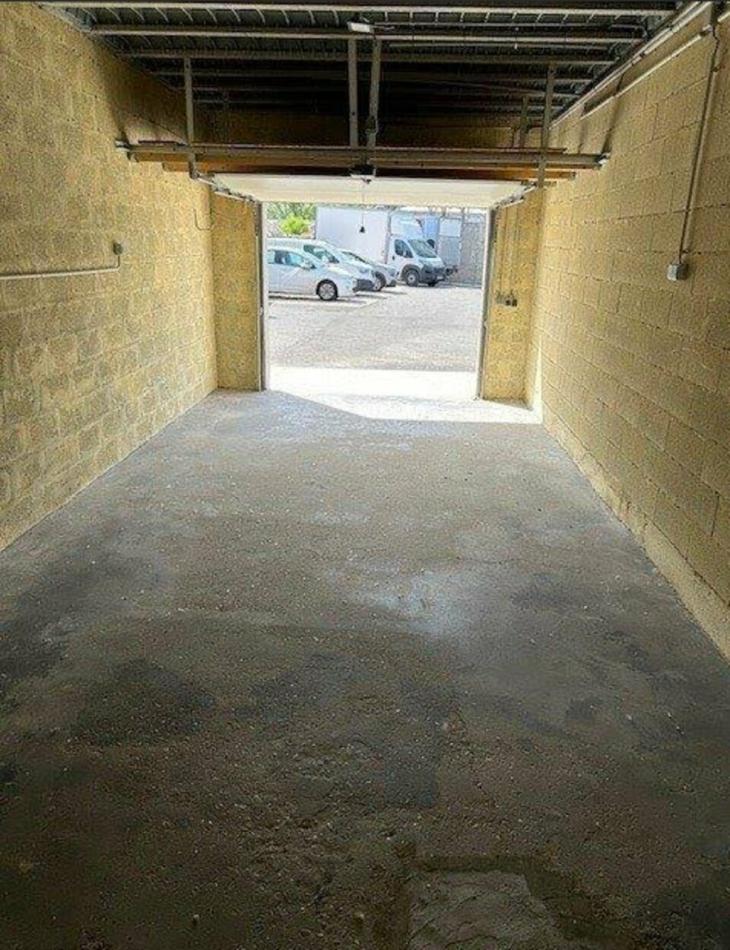 Entrepôt de 28 m² (3,50 x 8,00 m) avec sol béton et porte sectionnelle motorisée donnant sur une cour.